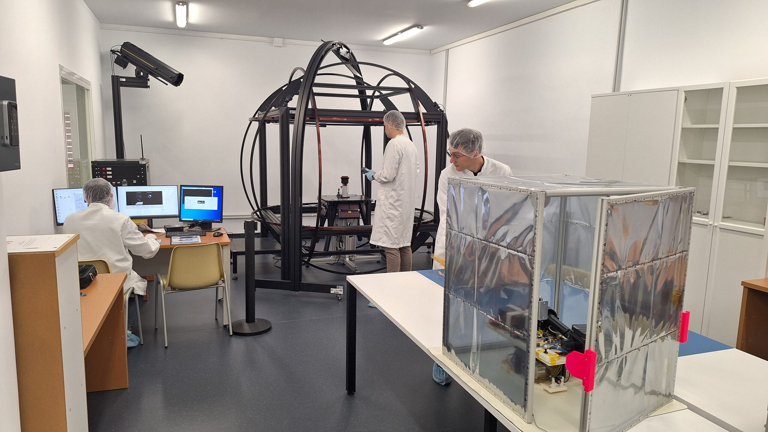 El banco de ensayos de actitud incluye un sistema de flotación basado en un air-bearing, que permite simular el movimiento libre del satélite en el espacio. Además, cuenta con una estructura formada por bobinas de Helmholtz que permite generar un campo magnético controlado, y con una serie de simuladores que “engañan” a los sensores embarcados en el satélite. Entre ellos, destacan un simulador de estrellas, un simulador solar y un simulador de señales GNSS. Este equipo permite probar sistemas de control de actitud para satélites, desde pequeños CubeSats de 1U hasta sistemas diseñados para satélites de hasta 100 kg.