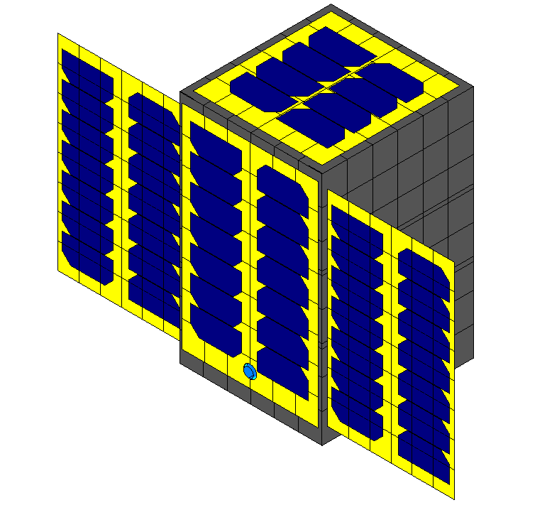 2 paneles solares fijos y 2 paneles desplegables. Potencia media generada en órbita de 30 W. Batería de Li-ion