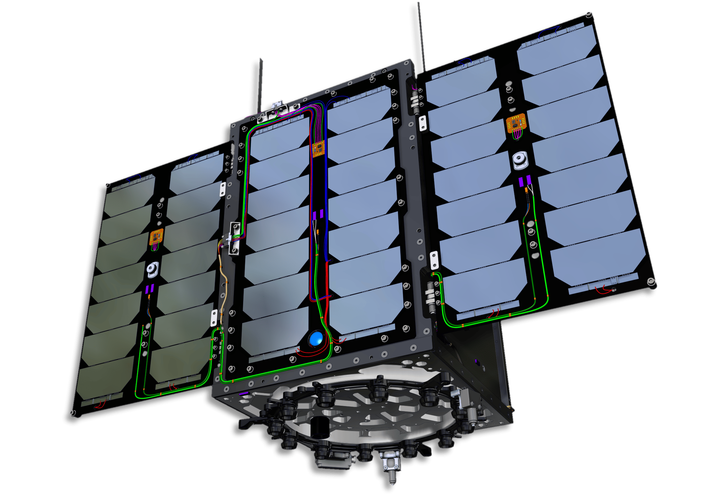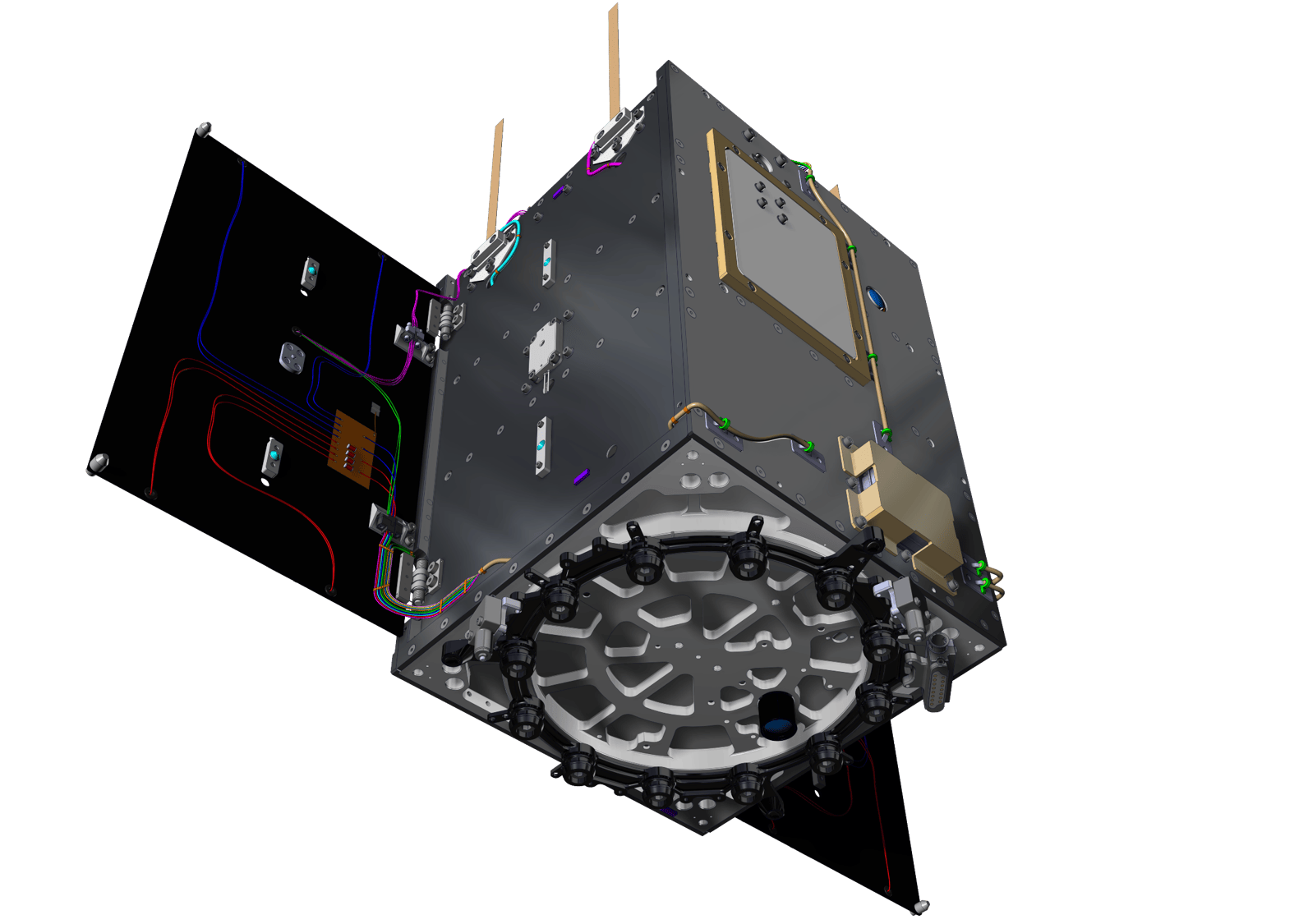 Entre las soluciones implementadas destaca un radiador diseñado específicamente para disipar el calor generado por una de las cargas de pago. Este radiador está aislado del resto de la estructura mediante un marco de PEEK y unido a este mediante adhesivo estructural, lo que reduce significativamente la transferencia de calor por conducción. Además, debido a las compactas dimensiones del satélite, se ha tenido que diseñar un thermal strap de cobre, que conecta térmicamente la carga de pago con el radiador para cumplir con los requisitos térmicos.