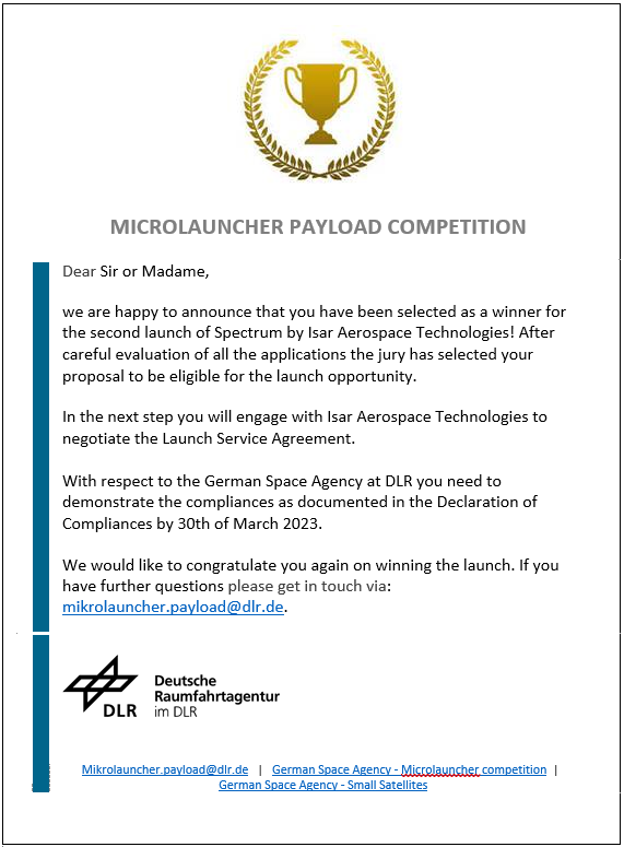 Desde el IDR/UPM hemos conseguido dar continuidad a la línea de desarrollo de estos pequeños satélites, gracias a haber logrado ser seleccionados en el concurso promovido por el DLR alemán (Deutsches Zentrum für Luft-und Raumfahrt) y la Agencia Espacial Europea (ESA) para proporcionar una oportunidad de un lanzamiento (sin coste) con el vehículo SPECTRUM de la empresa ISAR, en Q2-Q3 de 2025.